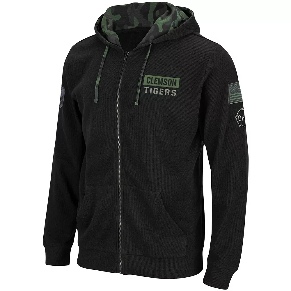 Elevate your Clemson Tigers gear by grabbing this OHT Military Appreciation full-zip hoodie from Colosseum. It features embroidered Clemson Tigers graphics that coordinate with the camo pattern on the drawstrings and hood lining. You’ll proudly represent your favorite collegiate squad when you put on this military-inspired outerwear.