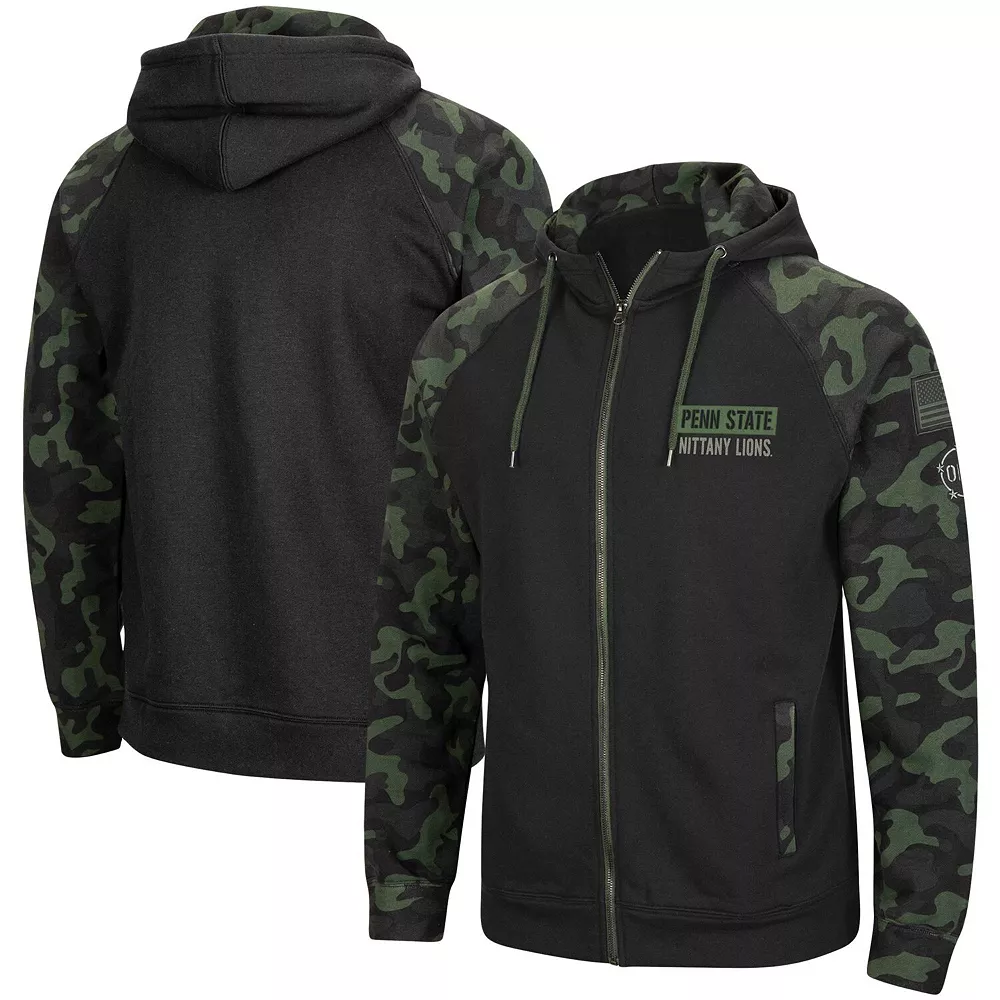 Does the cooler weather have you wondering how you’ll be able to show off your support for the Penn State Nittany Lions? Well not to worry, because this Colosseum OHT Military Appreciation full-zip hoodie is perfect for you. It features a cool camo pattern on the raglan sleeves as well as stunning Penn State Nittany Lions graphics, which will help you express your fandom, even if the temperature drops.