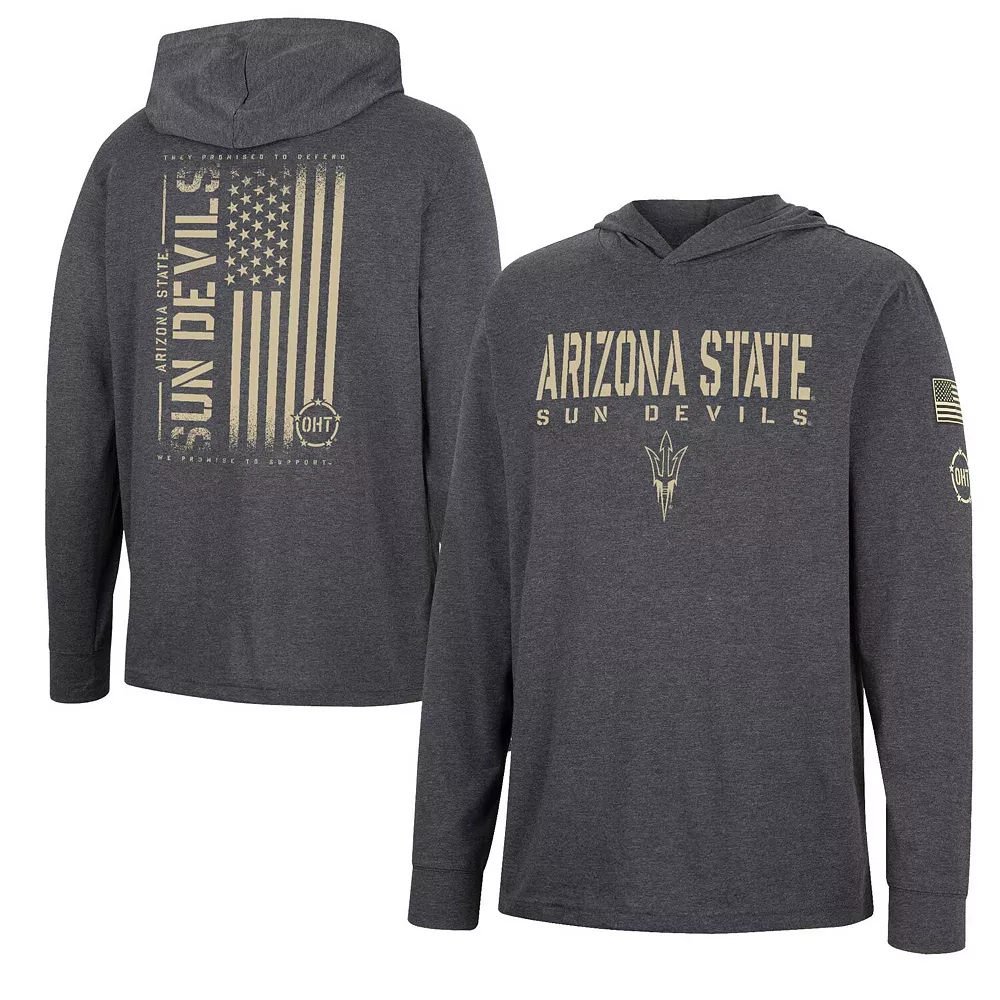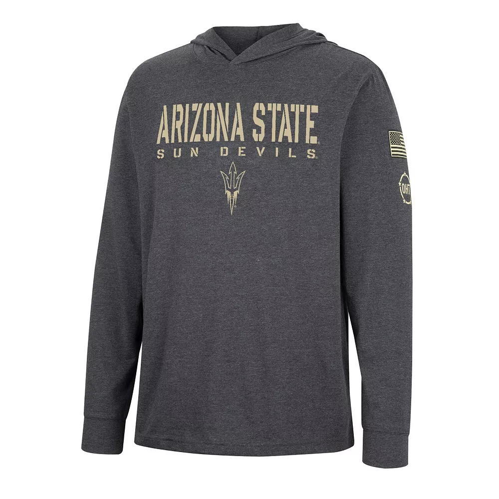 Represent the Arizona State Sun Devils in patriotic fashion with this Colosseum OHT hoodie T-shirt. Not only does it feature distressed team graphics across the front and back, but the embroidered American flag and Operation Hat Trick logo on the left sleeve allow you to give a big thank you to our military members. Showing your appreciation for those brave individuals and the Arizona State Sun Devils has never been easier than it is with this long sleeve tee.