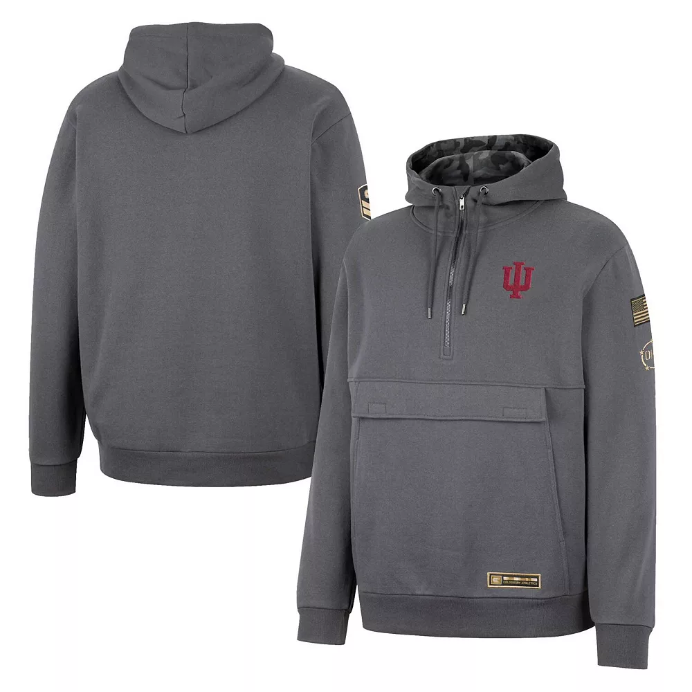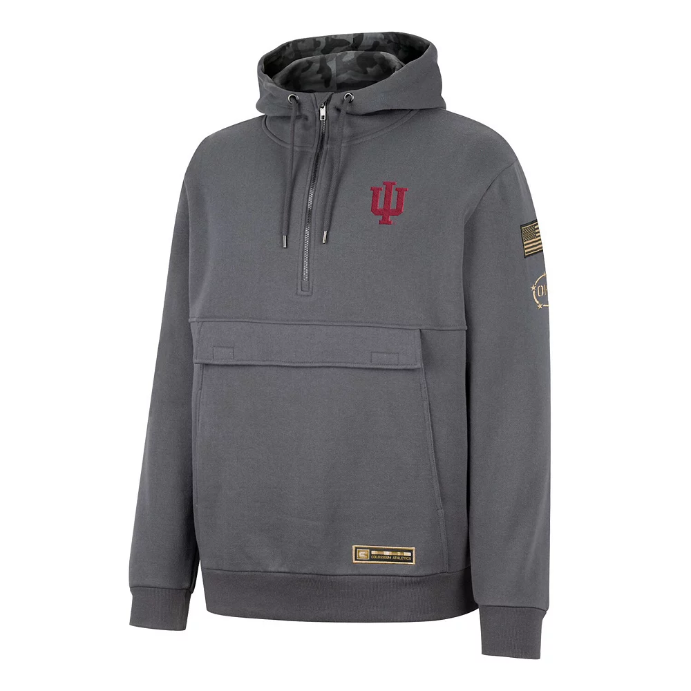 Add a patriotic piece of Indiana Hoosiers apparel to your rotation with this OHT quarter-zip hoodie from Colosseum. It features the team’s logo on the chest, as well as a sublimated camo pattern that lines the adjustable scuba hood. Every time you sport this Indiana Hoosiers midweight top, you’ll know that you are giving a big thank you to members of the military while also making a statement about your unwavering fandom.