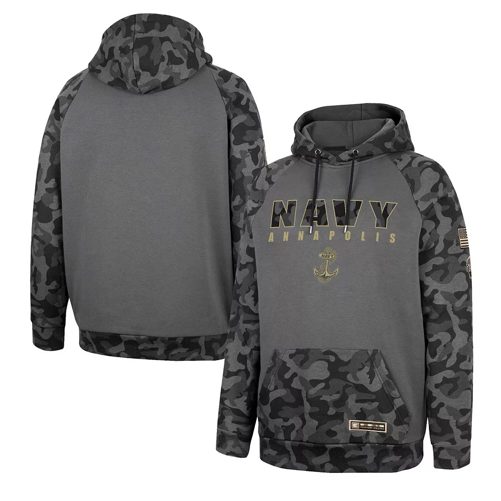 Your Navy Midshipmen spirit is noticeable year-round when you sport this Colosseum OHT Military Appreciation Stack hoodie during chilly months. Bold Navy Midshipmen graphics and an eye-catching camo pattern make for a dedicated fan look. Plus, raglan sleeves increase your arm room for more comfortable wear.