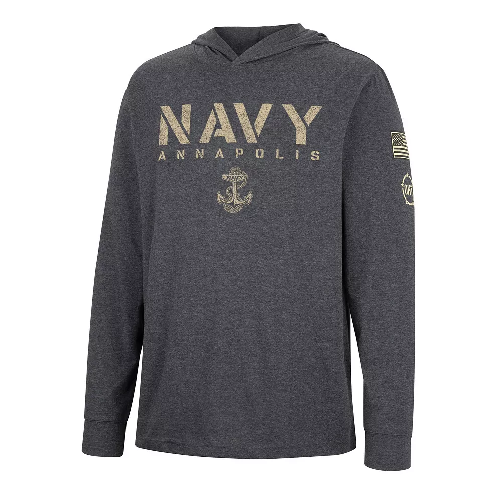 Represent the Navy Midshipmen in patriotic fashion with this Colosseum OHT hoodie T-shirt. Not only does it feature distressed team graphics across the front and back, but the embroidered American flag and Operation Hat Trick logo on the left sleeve allow you to give a big thank you to our military members. Showing your appreciation for those brave individuals and the Navy Midshipmen has never been easier than it is with this long sleeve tee.