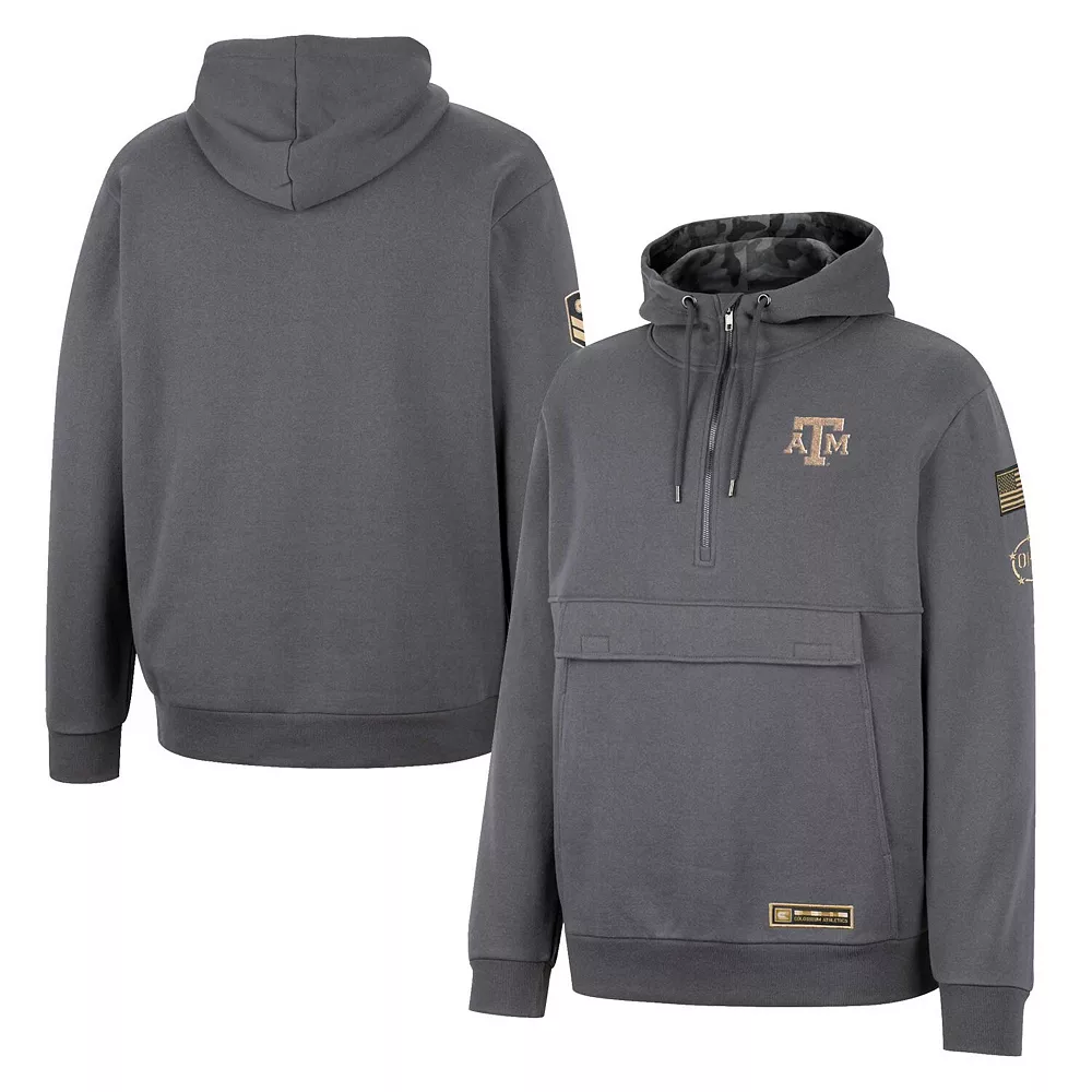 Add a patriotic piece of Texas A&M Aggies apparel to your rotation with this OHT quarter-zip hoodie from Colosseum. It features the team’s logo on the chest, as well as a sublimated camo pattern that lines the adjustable scuba hood. Every time you sport this Texas A&M Aggies midweight top, you’ll know that you are giving a big thank you to members of the military while also making a statement about your unwavering fandom.