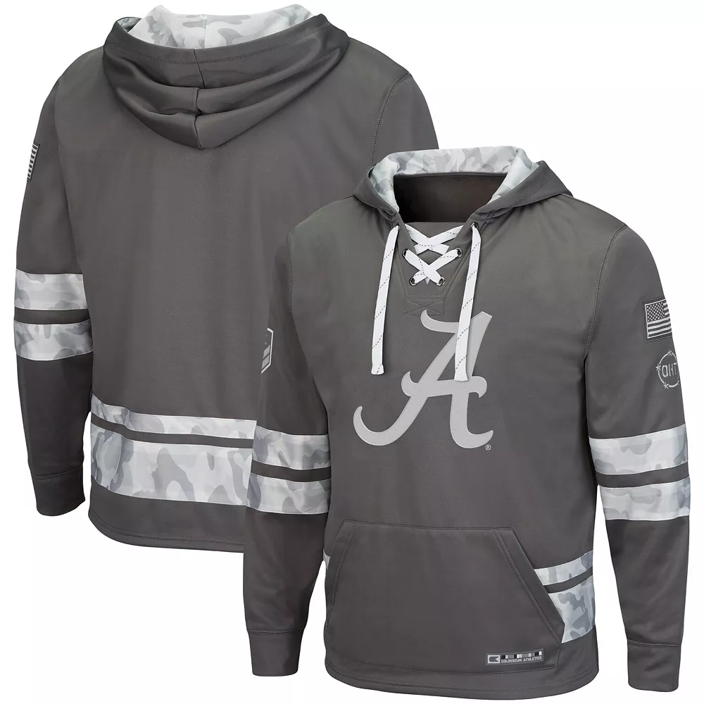 Display your support for the Alabama Crimson Tide in a meaningful way with this Lace-Up pullover hoodie from Colosseum. It features OHT Military Appreciation graphics on the left sleeve and the Alabama Crimson Tide logo designed to match the arctic camo pattern. An adjustable hood also provides additional warmth when needed.