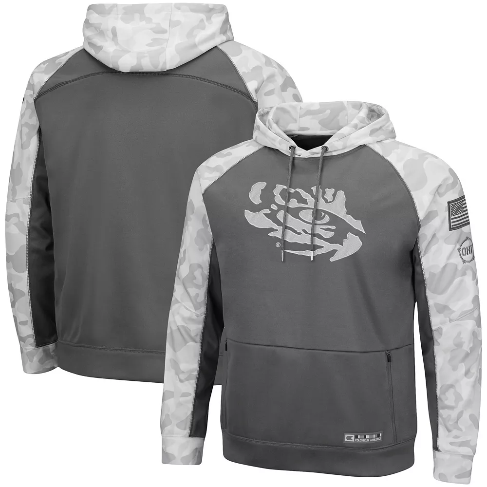 Show your love for the LSU Tigers and raise awareness for wounded service members and veterans by grabbing this OHT Military Appreciation Arctic Camo Tonal hoodie from Colosseum. It features a bold LSU Tigers graphic across the chest and an attention-grabbing camo pattern. In addition, its raglan sleeves offer ease of movement that makes for a relaxed fit.