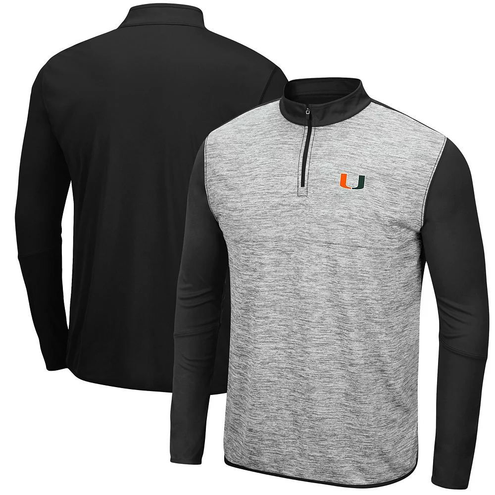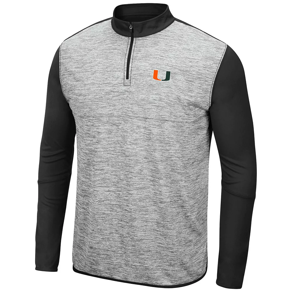Create an ensemble well suited to your Miami Hurricanes pride with this Prospect jacket. Colosseum has crafted a lightweight jacket that’s great as a layering piece or for keeping warm on slightly chilly days. Its subtle Miami Hurricanes graphics are enhanced by the contrasting sleeves, back and collar, allowing this quarter-zip to be paired with other team apparel easily.
