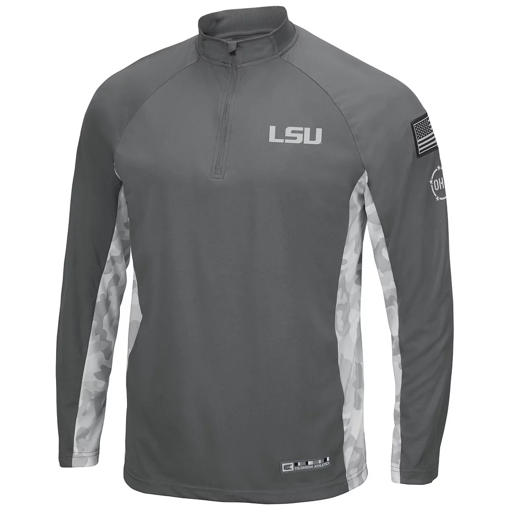 Layer up and show your team spirit in this OHT Military Appreciation Swoop quarter-zip jacket from Colosseum. It features sleek LSU Tigers graphics and an American flag to honor those that serve. Perfect for everyday wear, this LSU Tigers jacket is a great way to share your fandom with the world.