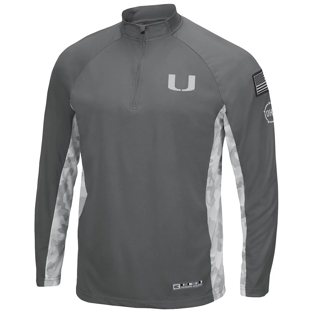 Layer up and show your team spirit in this OHT Military Appreciation Swoop quarter-zip jacket from Colosseum. It features sleek Miami Hurricanes graphics and an American flag to honor those that serve. Perfect for everyday wear, this Miami Hurricanes jacket is a great way to share your fandom with the world.
