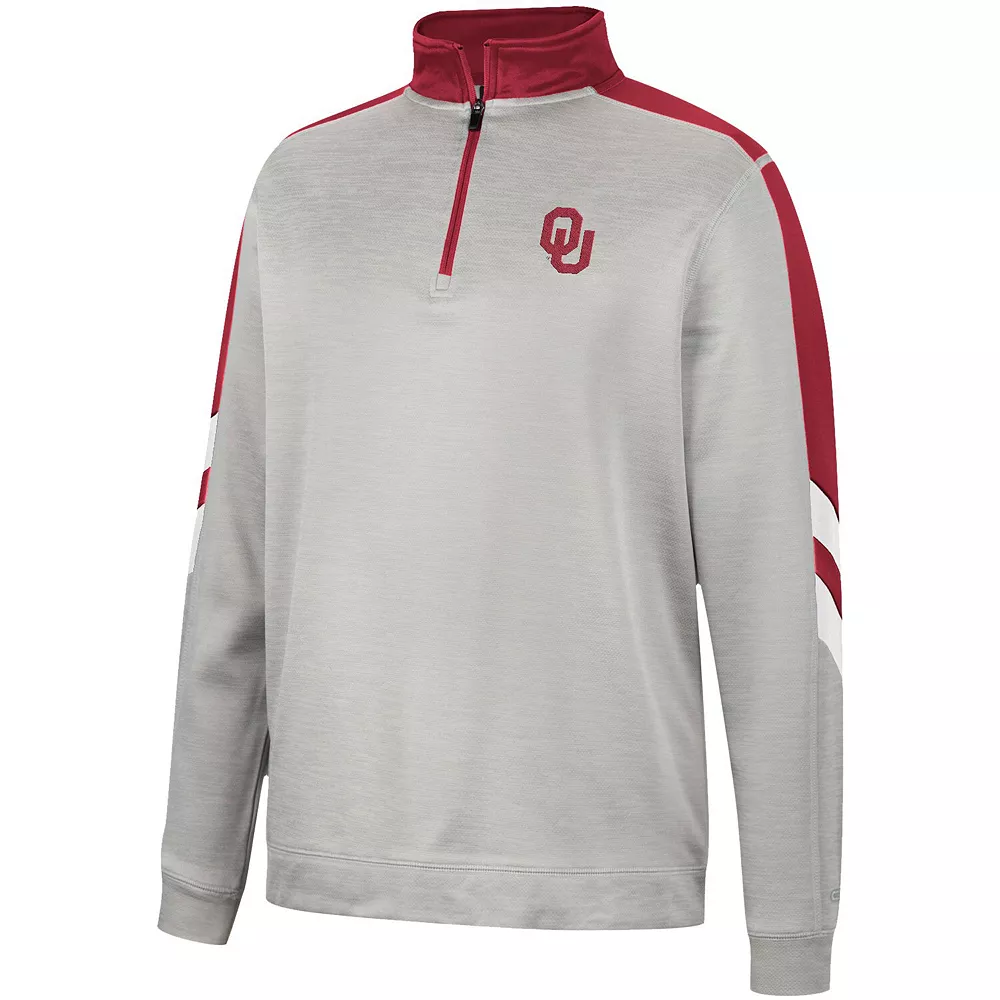 Focus attention on your Oklahoma Sooners fandom by wearing this Bushwood Fleece jacket from Colosseum. It features understated Oklahoma Sooners graphics highlighted by the contrasting sleeves in team colors. Additionally, the quarter-zip closure provides built-in venting to help you stay comfortable as weather conditions change.