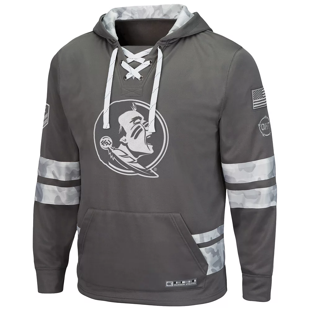 Display your support for the Florida State Seminoles in a meaningful way with this Lace-Up pullover hoodie from Colosseum. It features OHT Military Appreciation graphics on the left sleeve and the Florida State Seminoles logo designed to match the arctic camo pattern. An adjustable hood also provides additional warmth when needed.