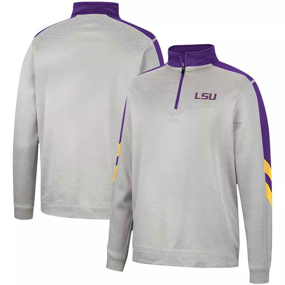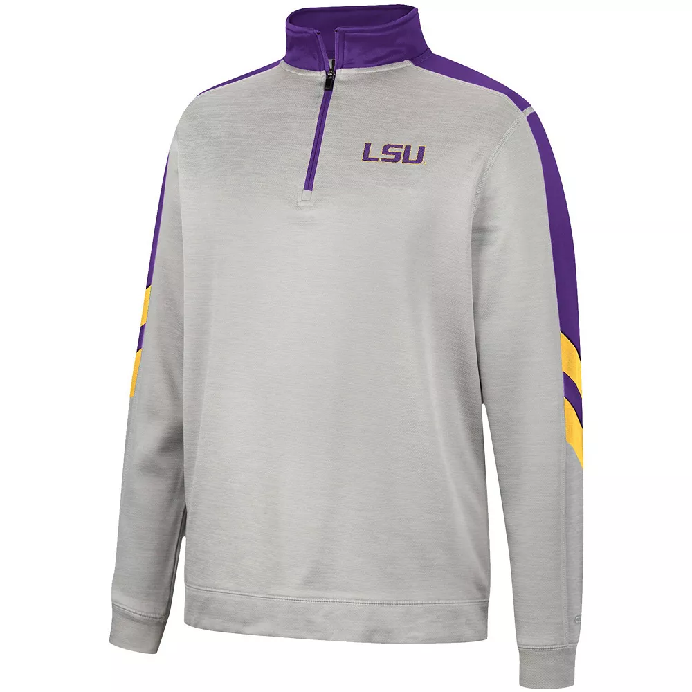 Focus attention on your LSU Tigers fandom by wearing this Bushwood Fleece jacket from Colosseum. It features understated LSU Tigers graphics highlighted by the contrasting sleeves in team colors. Additionally, the quarter-zip closure provides built-in venting to help you stay comfortable as weather conditions change.