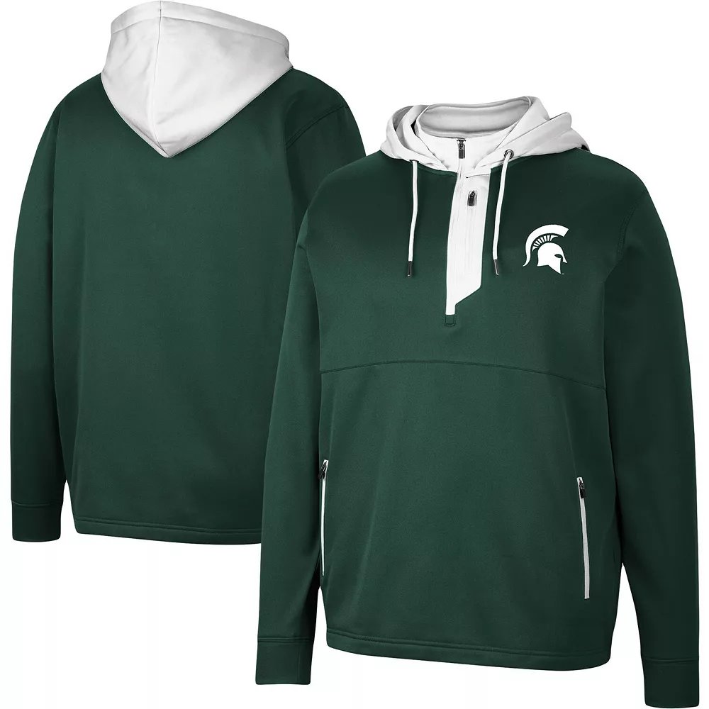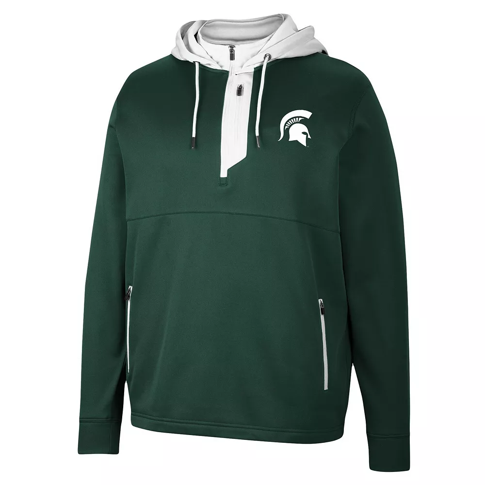 Upgrade your collection of official Michigan State Spartans apparel with this Luge 3.0 quarter-zip hoodie from Colosseum. It features the team’s iconic logo on the chest and a contrast-color hood and drawstring, meaning your die-hard fandom will never be in doubt. The three zippered pockets on the front of this midweight top help keep your keys, tickets and other Michigan State Spartans game day essentials safe and secure.