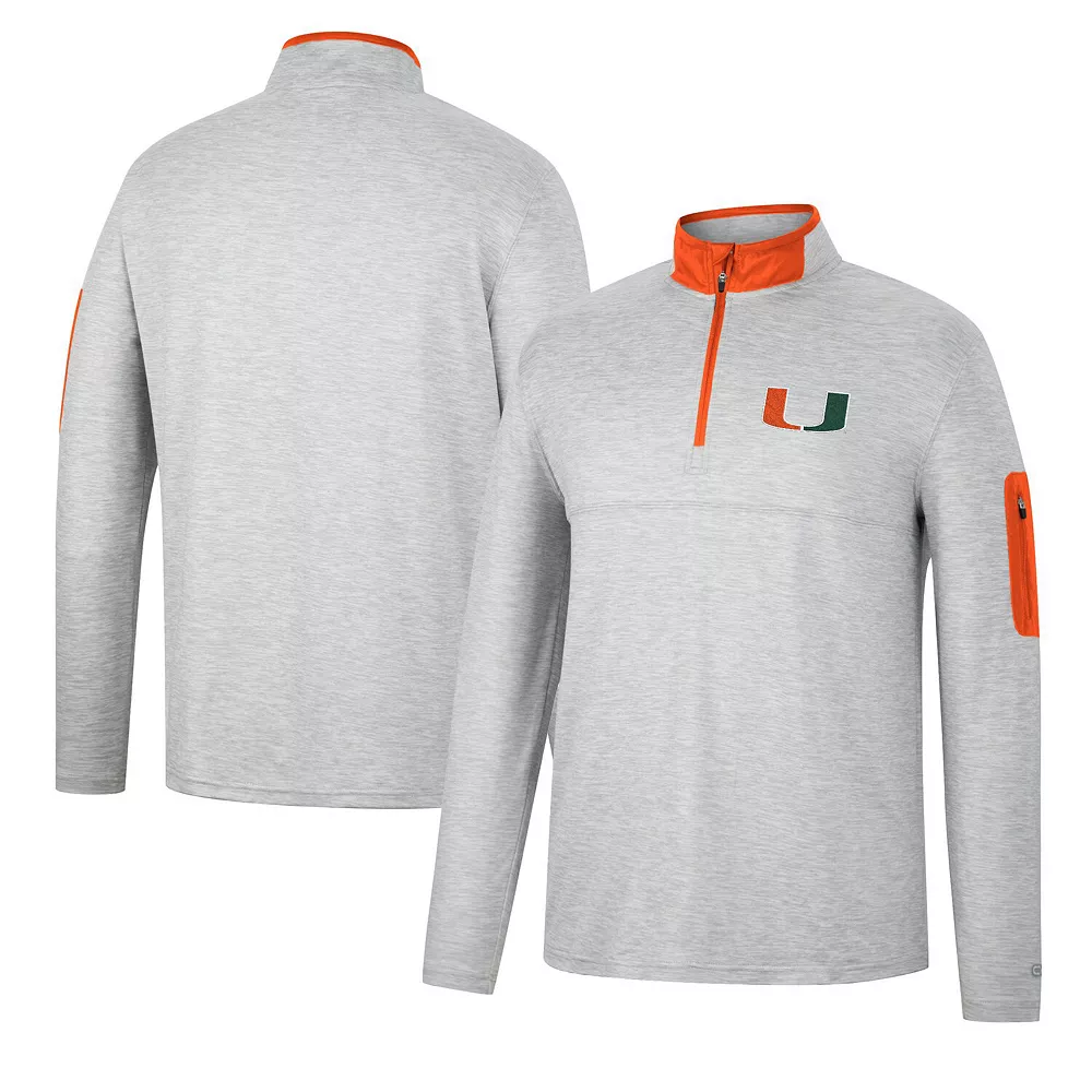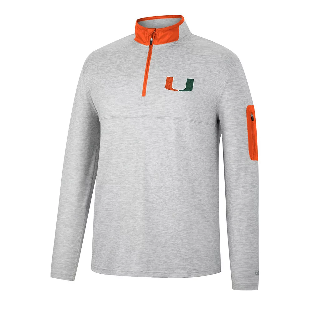 Grab this Colosseum Country Club quarter-zip jacket to show off your fiery Miami Hurricanes spirit in style. It offers lightweight construction to promote breathability as well as a zippered sleeve pocket to securely hold essentials. On top of that, the Miami Hurricanes graphics let everyone know who you root for come game day.