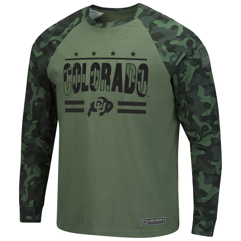 Show off your Colorado Buffaloes pride with this OHT Military Appreciation T-shirt from Colosseum. It features a sublimated camo design, but there’s no hiding your love for the Colorado Buffaloes thanks to the printed graphics. Raglan sleeves also provide flexible movement, so you can proudly rep your favorite college team in a more comfortable tee.