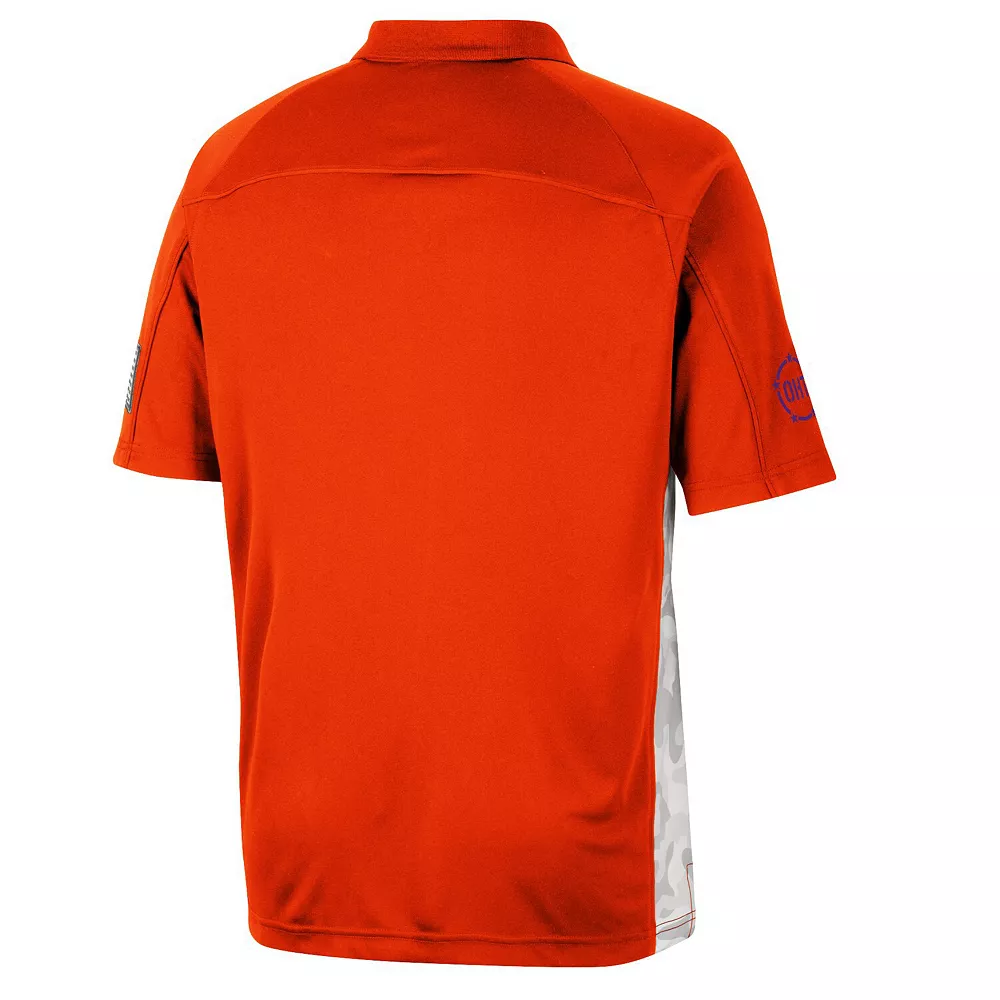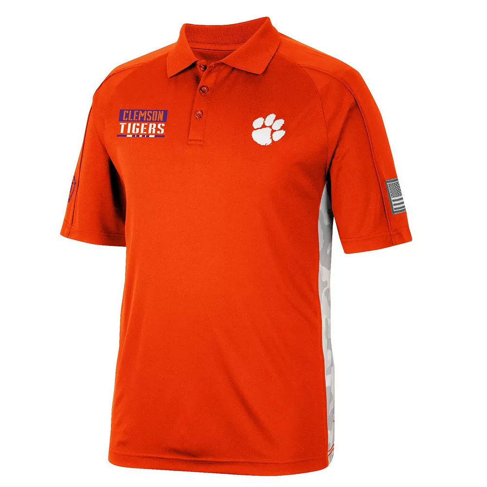 Support the Clemson Tigers and a patriotic cause with this OHT Military Appreciation Snow Camo polo from Colosseum. It features striking team graphics on the front and an American flag applique on the left sleeve. The subtle snow camo pattern on the side gives this Clemson Tigers polo a unique finish.